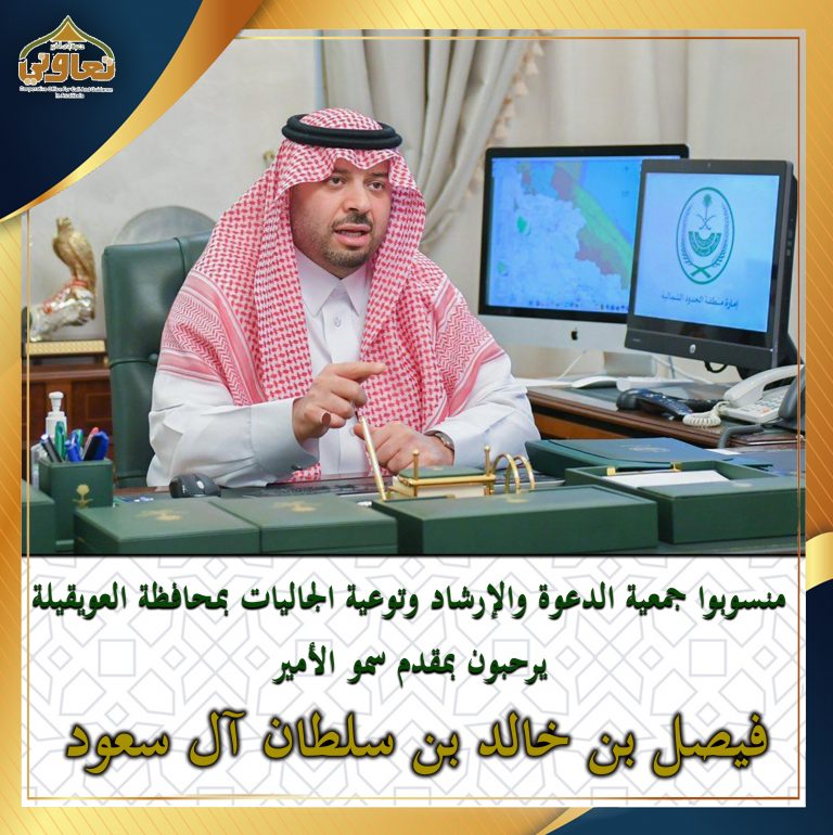 منسوبوا جمعية الدعوة والإرشاد وتوعية الجاليات يرحبون بقدوم سمو الأمير فيصل بن خالد بن سلطان أل سعود أمير منطقة الحدود الشمالية