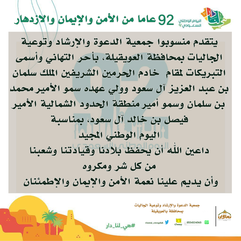 يتقدم منسوبوا جمعية الدعوة والإرشاد وتوعية الجاليات بمحافظة العويقيلة بأحر التهاني والتبريكات بمناسبة اليوم الوطني 92