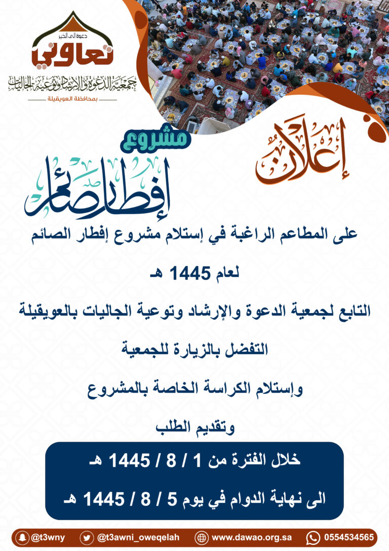 إعلان عن الكراسة الخاصة مشروع أفطار صائم لشهر رمضان المبارك لعام 1445